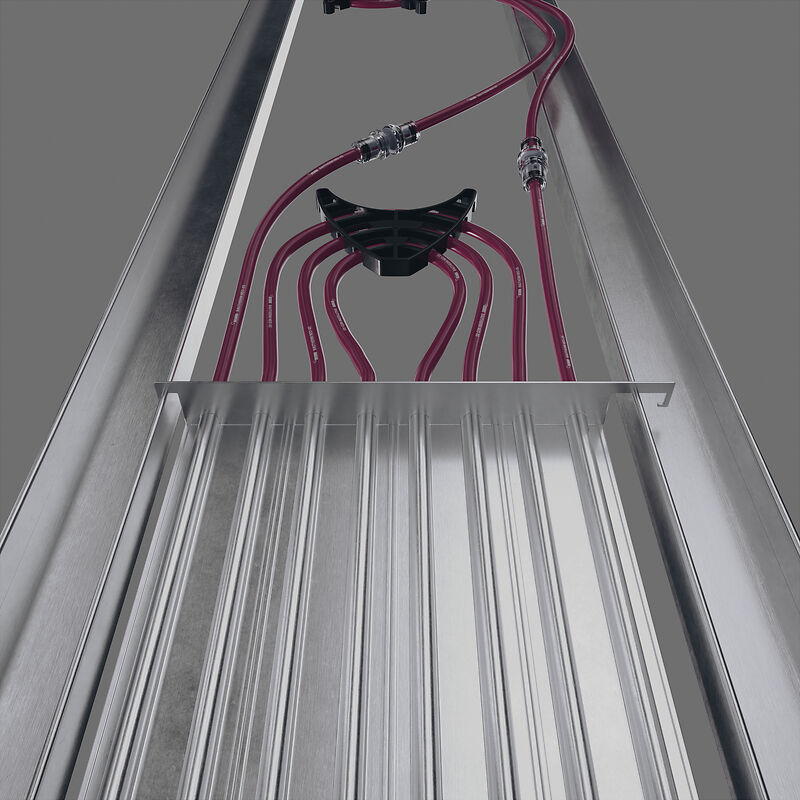Das System verfügt über asymmetrische Modulhalter, mit denen sich die Deckenmodule einfach und schnell in die Unterkonstruktion einhängen lassen. Das sorgt auch für eine echte Gewerketrennung zwischen Installation und Trockenbau und verkürzt gleichzeitig den Installationsvorgang. Die Montage des Systems mit der Anbindung wird vom Fachgewerk Sanitär, Heizung, Klima (SHK) übernommen. Die vom Gewerk Trockenbau erstellte Metallunterkonstruktion muss nachträglich nicht mehr angepasst werden, denn die Asymmetrie des Modulhalters bietet genügend Spiel, wodurch das Einhängen problemlos möglich ist.