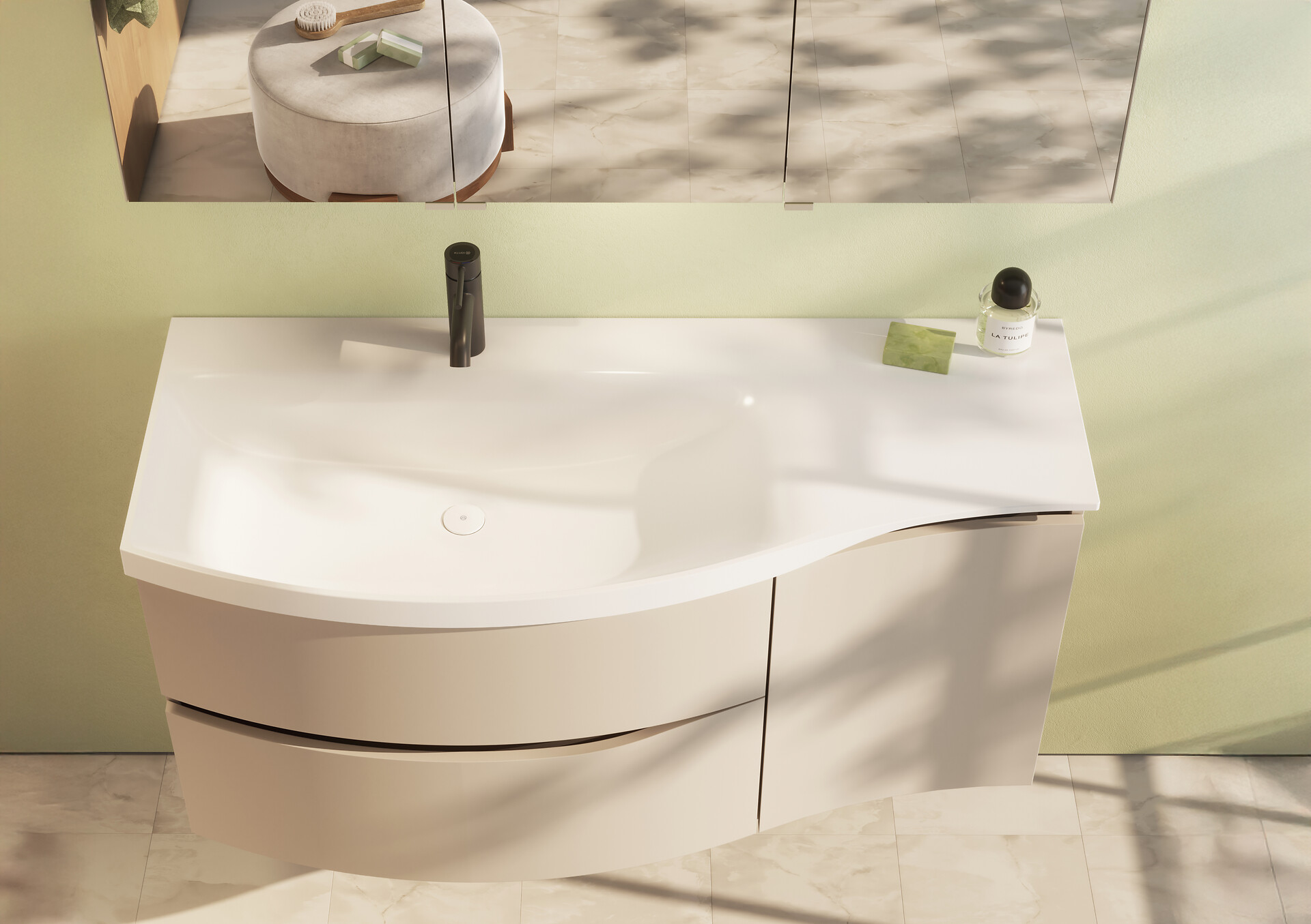 Inspiriert von weitläufigen Landschaften mit sanften, sich hintereinander schmiegender Hügelkuppen zieht sich das dreidimensionale Wechselspiel von konkaven und konvexen Formen und horizontalen Linien über das gesamte Programm von Sinea 3.0: Mal wölben sich Möbelfront und Waschtischkante vor, mal weichen sie sich verjüngend zurück und bieten so ein Optimum an randnah realisiertem Beckenvolumen und seitlicher Ablagefläche. Auch Ablage und Lichtsegel von Wandspiegel und Spiegelschrank folgen diesem rhythmischen Richtungswechsel: Während die über der Armatur tiefenreduzierte Spiegelablage Bewegungsfreiraum schafft, wölbt sich das darüber schwebende Lichtsegel wieder vor, um das Gesicht von oben optimal auszuleuchten. Die Schränke nehmen das horizontale Wellenlinien-Design durch den Dekorverlauf und die markanten Griffmulden auf.